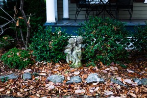 A weathered stone statue of two children embracing is nestled among lush green bushes and scattered autumn leaves. The scene captures a sense of nostalgia and tranquility, accentuated by the soft, overcast lighting that emphasizes the earthy tones around them. The composition creates a cozy yet slightly melancholic mood, inviting reflection on innocence and time.