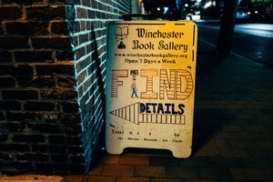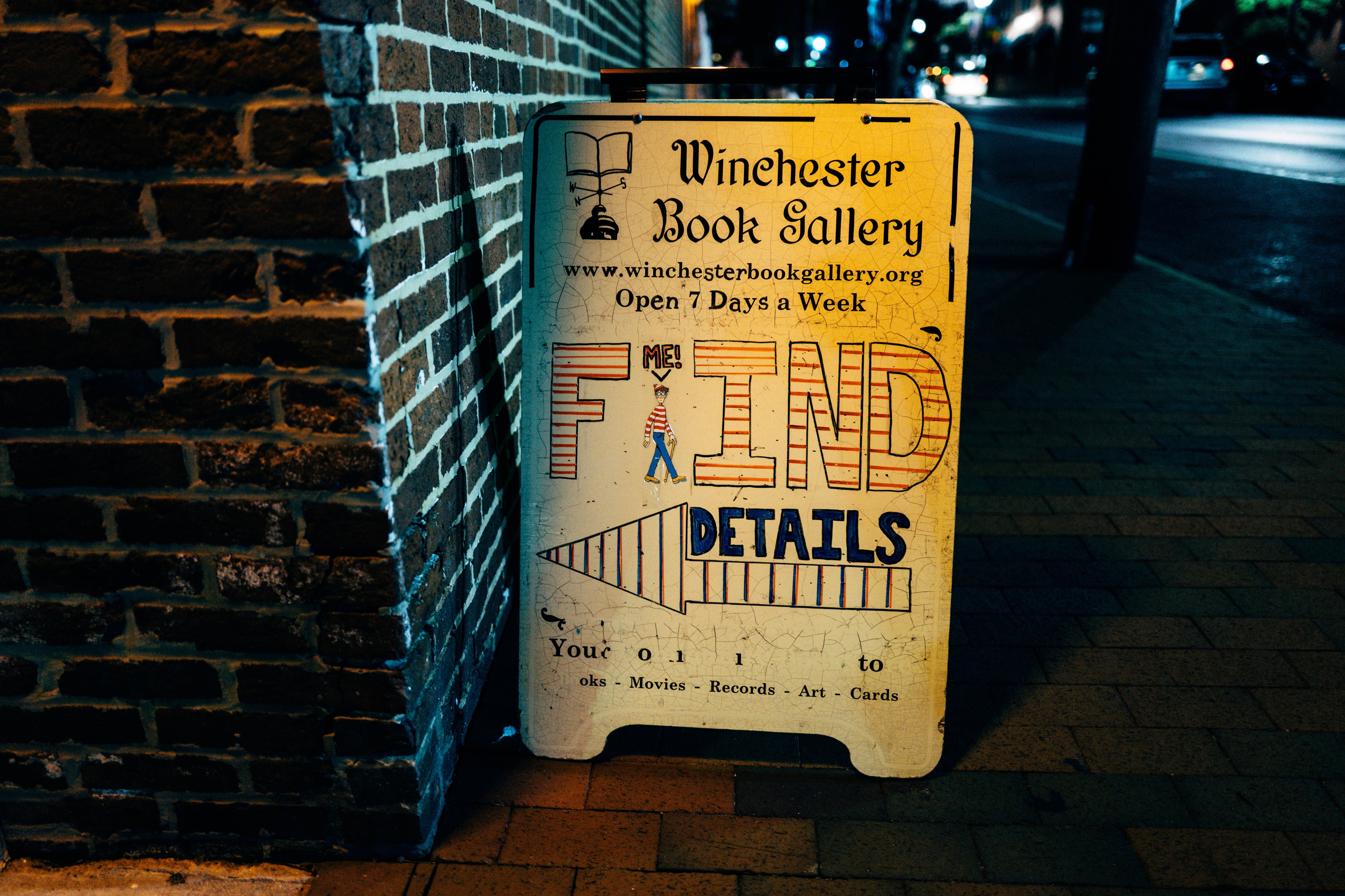 The photograph features a brightly illuminated sign for the Winchester Book Gallery, set against a backdrop of a dimly lit brick wall. The playful typography and colorful illustration invite onlookers to engage with the vibrant offerings of the shop, creating a whimsical and welcoming atmosphere. Nighttime shadows and street lighting enhance the cozy yet intriguing mood of this urban setting.