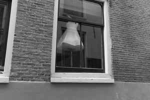 In a quiet urban setting, a delicate white dress form stands poised in a window, seemingly frozen in time. The stark black-and-white composition enhances the contrast between the smooth fabric and the rough brick exterior, evoking a sense of nostalgia and contemplation. Soft, diffused light filters in, adding a serene mood that invites viewers to imagine the stories behind the garment.