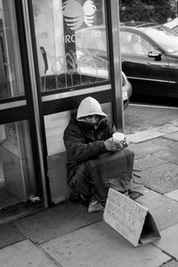A somber black-and-white photograph captures a man sitting against a telephone booth, his demeanor reflecting weariness and longing. Clutching a disposable cup, he is shielded by a hood, while a cardboard sign expressing his need for help rests against his knees. The muted tones and urban backdrop amplify the mood of isolation and vulnerability amidst the bustling world around him.
