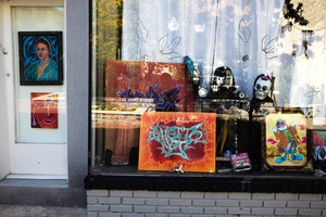 The photograph captures a vibrant window display brimming with an eclectic mix of artwork, ranging from portraits to colorful street art. The lighting accentuates the vivid colors and textures, creating a lively, inviting atmosphere that beckons passersby. The assortment reflects a playful creativity and urban culture, harmonizing both artistic styles and whimsical elements.