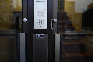 The photograph captures an urban entrance, emphasizing a metallic doorbell panel interspersed with sleek, reflective surfaces. The shallow depth of field creates a sense of intimacy, while the subdued lighting evokes a mysterious, almost contemplative mood. The composition invites the viewer to ponder on the threshold between public and private spaces.