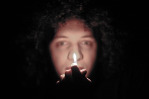 In this intimate portrait, a figure holds a flickering flame close to their face, creating a stark contrast against the enveloping darkness. The soft light highlights their features, casting shadows that evoke a sense of introspection and mystery. The overall mood is contemplative, drawing the viewer into a moment suspended in time.