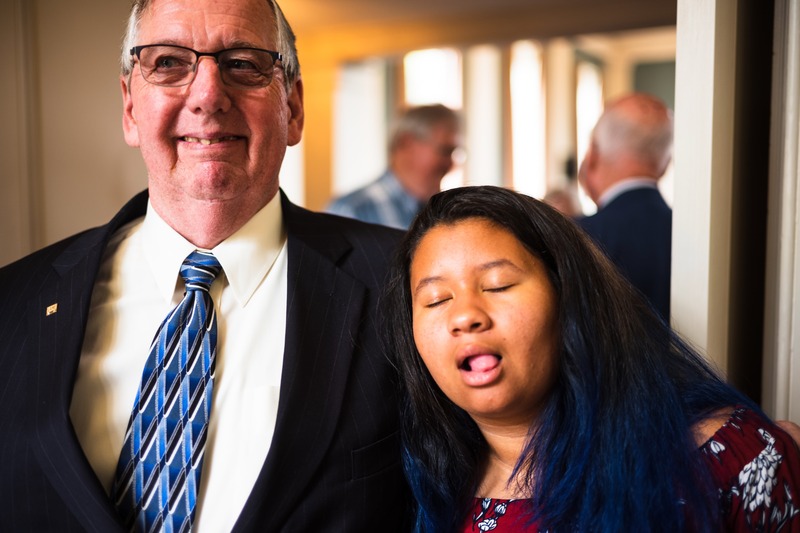 The photograph captures a candid moment between a smiling man in a suit and a young woman, who playfully makes a funny face. The warm lighting enhances the cheerful atmosphere, while the blurred background hints at a lively gathering. This playful interaction exudes a sense of warmth and camaraderie, inviting viewers into a private moment of joy.