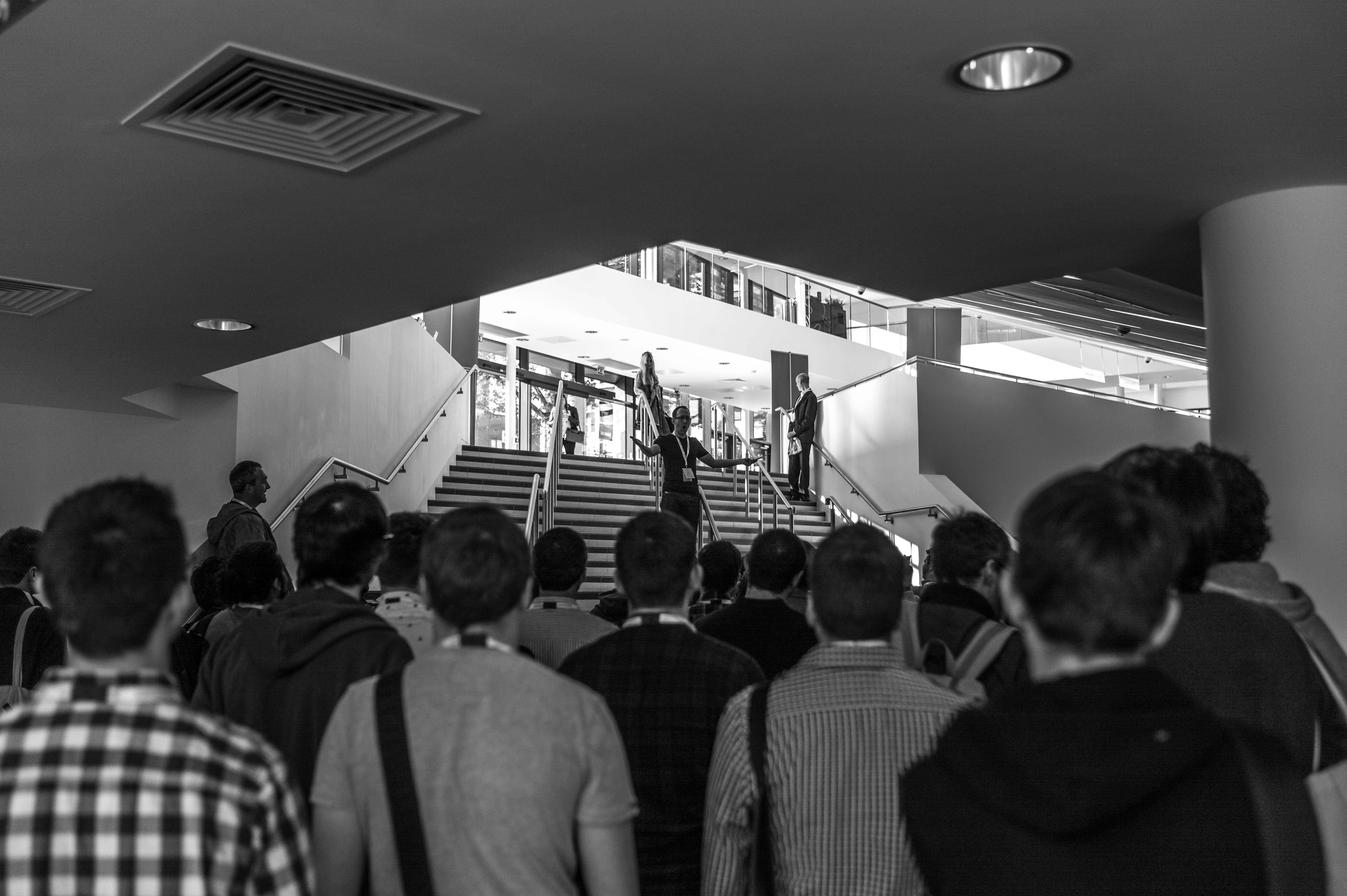 In this black-and-white scene, a group of individuals stands in the foreground, their backs to the viewer, looking up at a duo performing or speaking on the stairs above. The composition draws the eye upward, emphasizing the sense of anticipation and engagement within the crowd. Soft natural light filters through the space, creating a dynamic contrast between the darker figures and the brighter, open area above.