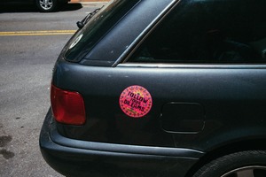The photograph captures the rear of a dark sedan adorned with a vibrant sticker reading 'FOLLOW YOUR DREAMS.' Sunlight bathes the scene, creating a warm and optimistic mood amid the urban backdrop, where subtle shadows hint at movement. The composition draws the eye directly to the sticker, making a bold statement that contrasts with the understated vehicle, evoking a sense of personal aspiration in a bustling environment.