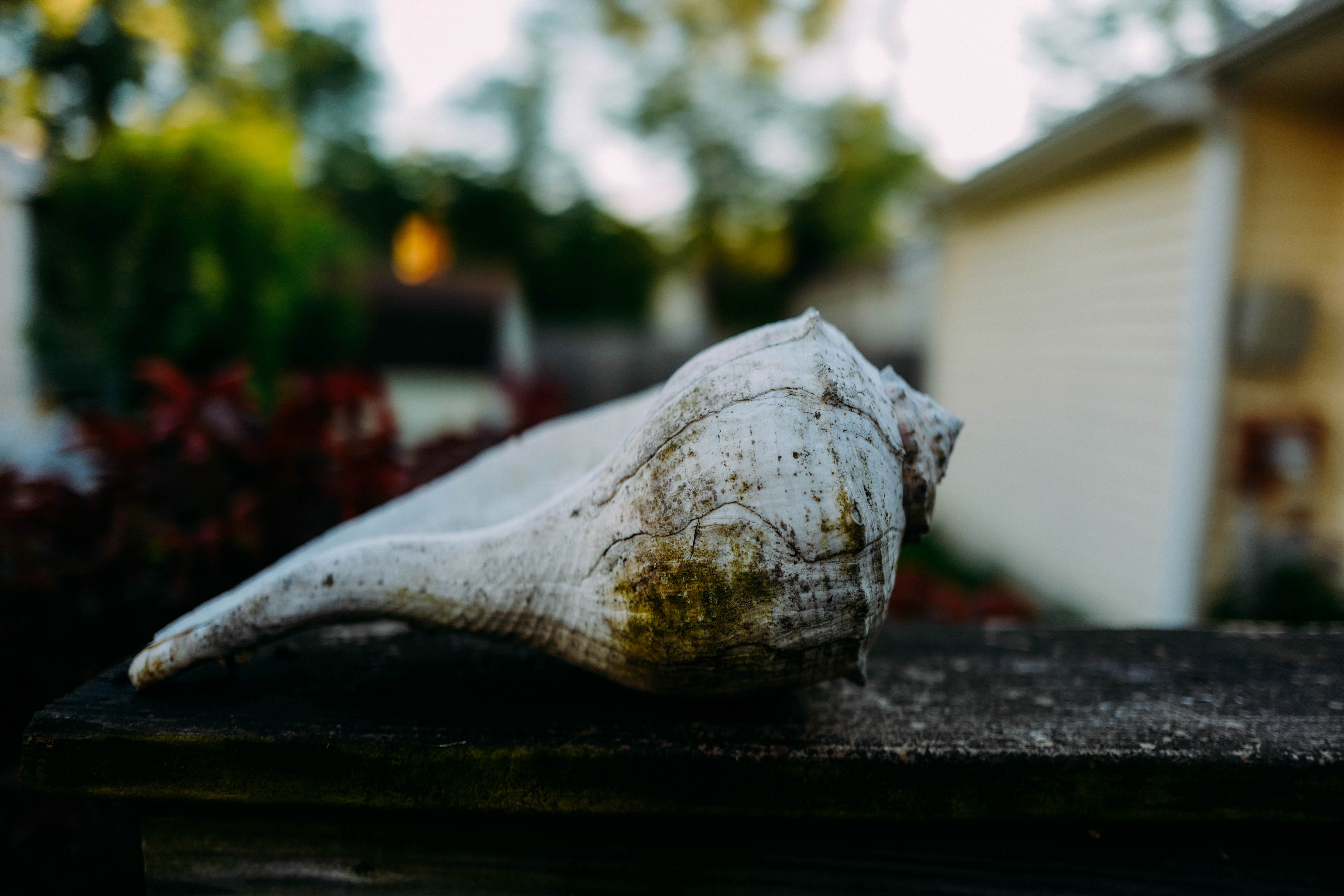 A beautifully textured seashell rests on an old wooden railing, capturing the viewer's attention with its organic curves. The soft afternoon light gently highlights the shell's intricate details while creating a serene atmosphere, hinting at forgotten stories of the ocean. In the background, blurred greenery adds a sense of tranquility and connection to nature.