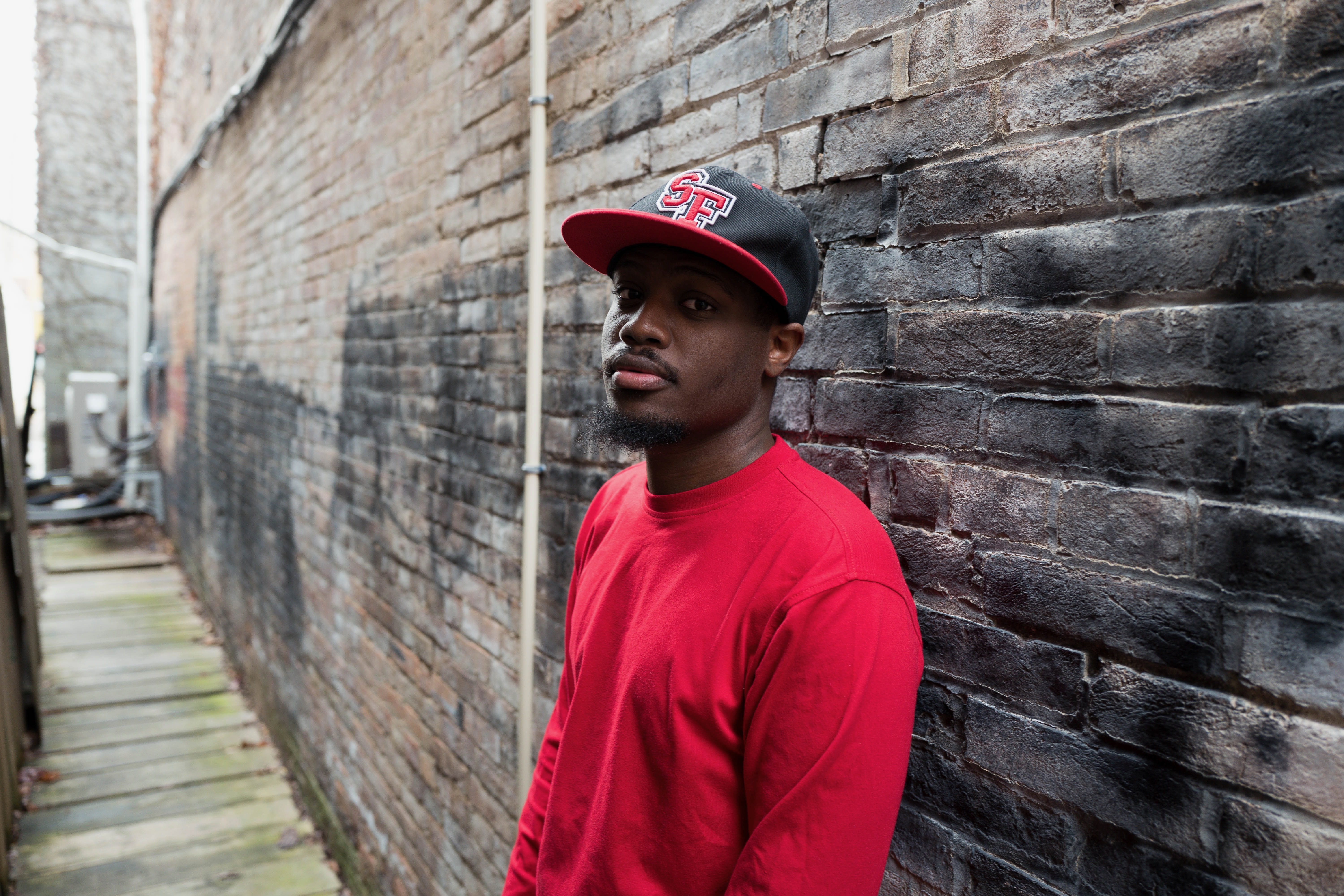 In a narrow alley, a young man in a bright red shirt and baseball cap leans against a weathered brick wall. The subdued lighting casts a reflective mood, emphasizing his thoughtful expression and the rough texture of the surroundings. The composition draws the eye along the alley, creating a sense of isolation amidst urban life.