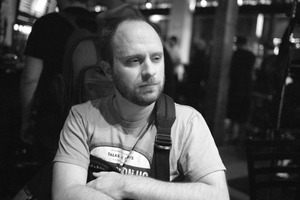 In a dimly lit space, a man sits pensively, his expression introspective and distant. The soft glow of ambient light creates a moody atmosphere, with blurred figures in the background hinting at a lively setting. The stark contrast of black and white emphasizes his thoughtful demeanor, drawing the viewer into his quiet contemplation.