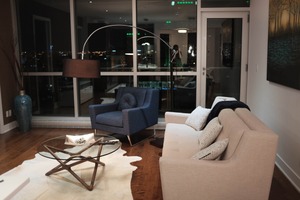 This modern living room exudes warmth and sophistication, illuminated by soft lighting that highlights its elegant furnishings. A plush blue armchair and a light beige sofa create a comfortable seating area, framed by large windows revealing a sparkling city skyline at night. The minimalist decor, featuring a glass table and artistic accents, invites relaxation and stylish conversation amidst a serene urban backdrop.