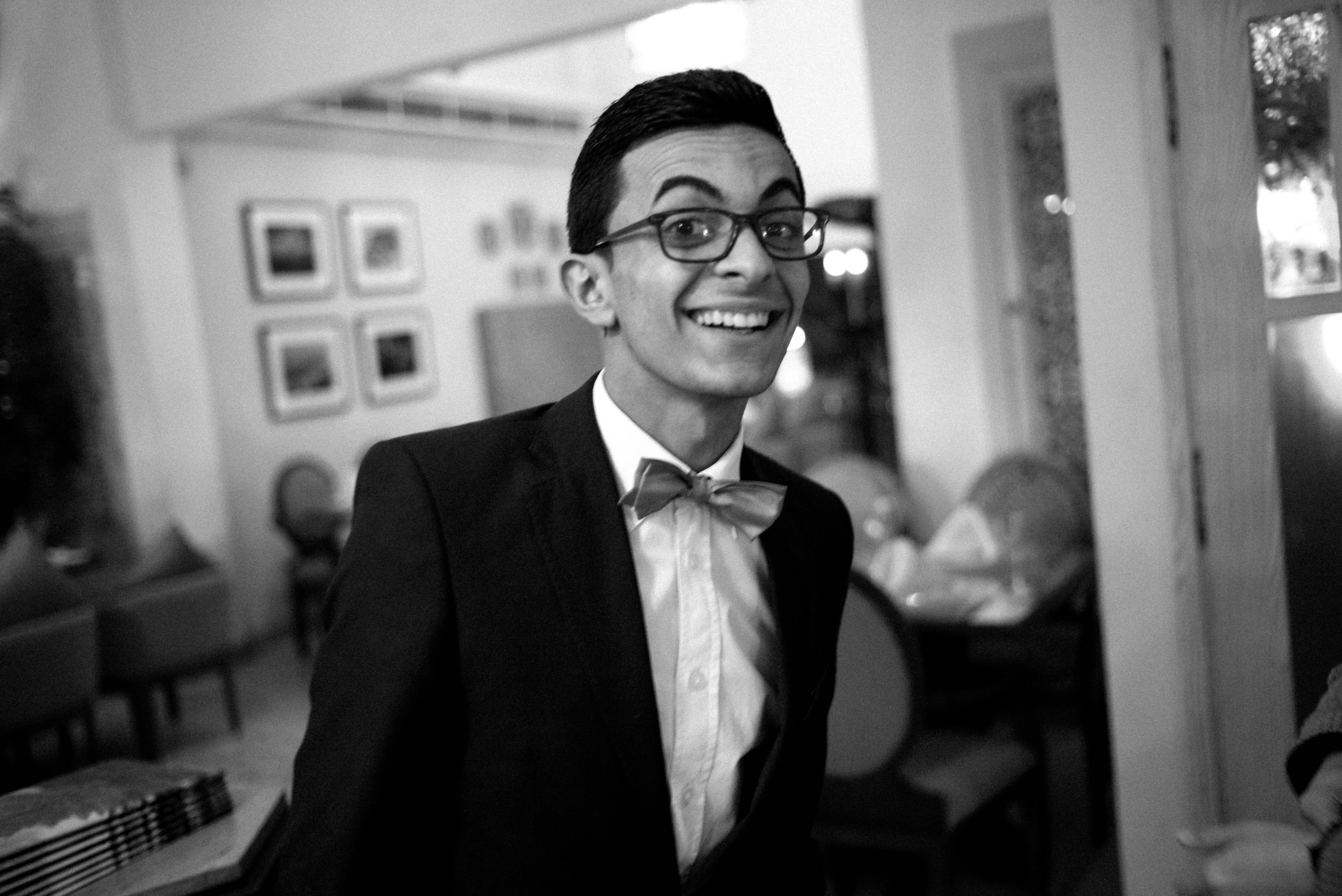 In a stylish black-and-white setting, a young man dressed in a formal suit and bowtie beams with delight, radiating charisma and youthful enthusiasm. The soft lighting accentuates his genuine smile, while the blurred background hints at a lively social gathering, enhancing the atmosphere of celebration. This candid moment captures the essence of joy and elegance, inviting viewers into a world of warmth and festivity.