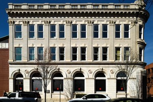 The photograph captures a grand, historic building characterized by its classical facade and intricate architectural details. Bathed in bright sunlight, the structure exudes a sense of timeless elegance, enhanced by the contrasting blue sky. The composition emphasizes the symmetry of the windows and arches, while the sparse trees and vehicles below ground provide a quiet urban context.