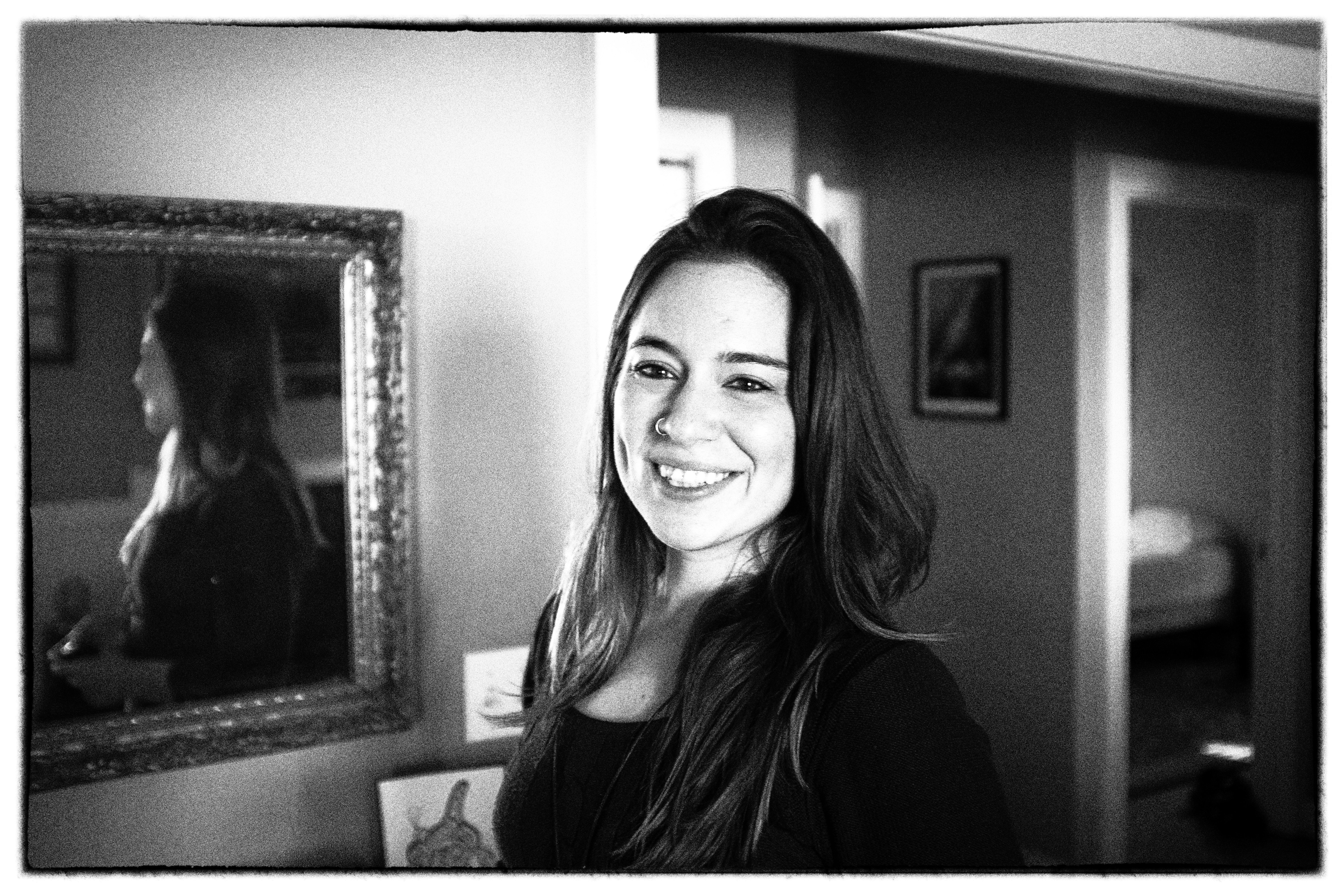 In this intimate portrait, a young woman stands confidently smiling, illuminated by soft, natural light that highlights her features. The composition contrasts her bright expression with the muted tones of the surroundings, while the mirror in the background adds depth and a touch of contemplation. The overall mood is warm and inviting, evoking a sense of personal connection and stillness.