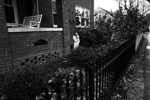 The photograph captures a serene yet melancholic scene of a quaint brick house with a swinging chair, framed by a wrought-iron fence and muted foliage. A lone statue stands watchfully in the garden, evoking a sense of nostalgia and stillness, while the black-and-white tones heighten the mood of solemnity and reflection. The composition draws the eye along the pathway, inviting contemplation of the stories held within the home's walls.