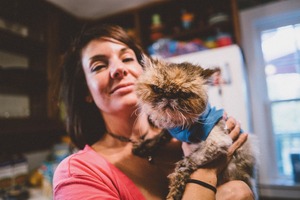In a cozy kitchen filled with warm light, a woman cradles a charmingly scruffy cat, both exuding a sense of affection and contentment. The soft focus around their faces highlights their close bond, while the vibrant surroundings suggest a lively home atmosphere. The woman's gentle smile and the cat's quirky expression add a playful touch to this intimate scene.
