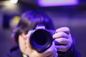 The photograph features a person holding a camera aimed directly at the lens, enveloped in a moody, purple-tinged light that adds an enigmatic quality. The focus is sharp on the camera lens, drawing attention to the act of capturing a moment while subtly blurring the subject's features, creating an intimate yet mysterious atmosphere. The composition emphasizes the connection between the photographer and their medium, inviting viewers to reflect on the nature of observation and creation.