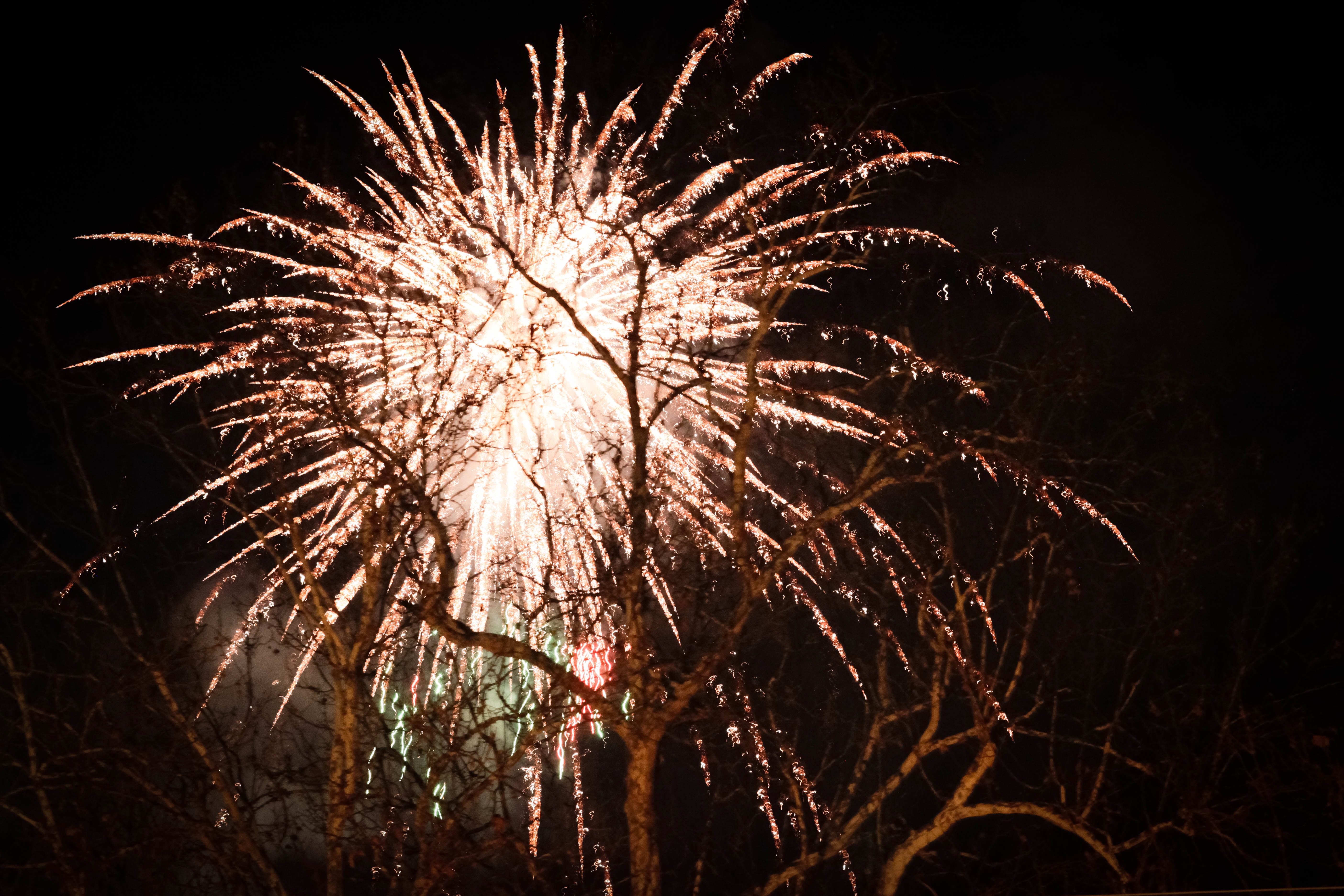 In a striking display, vibrant fireworks explode against a dark night sky, framed by the skeletal branches of trees. The contrasting shadows create a sense of depth, while the bright colors evoke a feeling of celebration and wonder. This juxtaposition captures the fleeting beauty of the moment, inviting viewers to immerse in the spectacle.