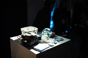 The photograph captures a table adorned with various objects, including neatly folded towels and colorful items, illuminated by soft, directional lighting. The dark background creates a striking contrast, lending an air of intrigue to the scene while shadowy figures linger softly in the distance. This composition evokes a sense of curiosity and invites viewers to explore the story behind the display.