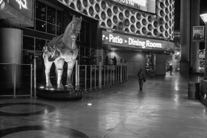 This black and white photograph captures a solitary horse statue standing regally in an urban setting, casting an imposing silhouette against a backdrop of dimly lit structures. The mood is contemplative and serene, enhanced by the soft glow of surrounding lights that highlight the sleek lines of the architecture. A lone figure walks past, creating a poignant contrast between the stillness of the statue and the movement of modern life.