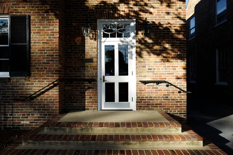 The photograph captures a charming brick doorway bathed in shadows, exuding an air of intrigue. The warm hues of the bricks contrast with the crisp white door, while soft lighting highlights the inviting steps leading up to the entrance. The interplay of light and shadow creates a contemplative mood, suggesting stories waiting to unfold beyond the threshold.