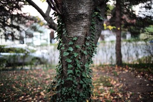 This photograph captures a textured tree trunk entwined with vibrant ivy, embodying a sense of harmony between nature and resilience. The soft, dappled light filtering through the leaves creates a tranquil atmosphere, while the blurred background hints at a serene garden environment. The interplay of leaf colors and the earthy tones of the bark evoke a feeling of peaceful solitude.