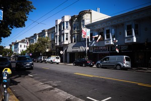 This photograph captures a vibrant urban street lined with colorful buildings, showcasing a mix of boutique shops and parked vehicles. The bright blue sky enhances the lively atmosphere, while the direct sunlight casts sharp shadows on the pavement, creating a dynamic contrast. Overall, the scene conveys a sense of everyday life, filled with character and charm.