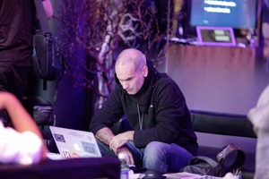 A man sits absorbed in his work, deeply focused on the screen of his laptop, which bears various stickers, hinting at his interests and creativity. The dim, moody lighting adds an atmosphere of concentration, while the blurred figures in the background suggest a busy environment, amplifying his solitude in the midst of activity. Subtle details, like the contrasting shadows and the muted color palette, enhance the contemplative mood of the scene.