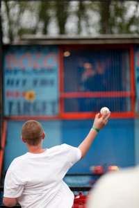 A young boy faces a brightly painted carnival game, ready to deliver a baseball with determined focus. The vibrant colors and playful atmosphere evoke a sense of excitement and anticipation, while the shallow depth of field draws the viewer’s eye to his concentration. Soft, diffused lighting adds a warm, nostalgic feel, capturing a moment of youthful exuberance surrounded by fun and whimsy.