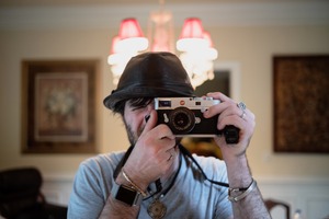 A man with a casual demeanor captures the moment with a classic camera. The soft glow of chandelier lights highlights his features and creates an inviting atmosphere, while his eclectic accessories hint at a creative spirit. The warm tones of the background add a sense of nostalgia and intimacy to the scene.