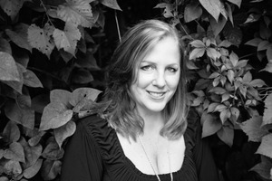In this striking black-and-white portrait, a woman grins warmly, framed by a lush tapestry of leaves that envelops her like a natural halo. The soft, diffused lighting enhances her features and the serene expression, creating an inviting and intimate atmosphere. The contrast between her warmth and the cool foliage brings a sense of harmony and connection with nature.