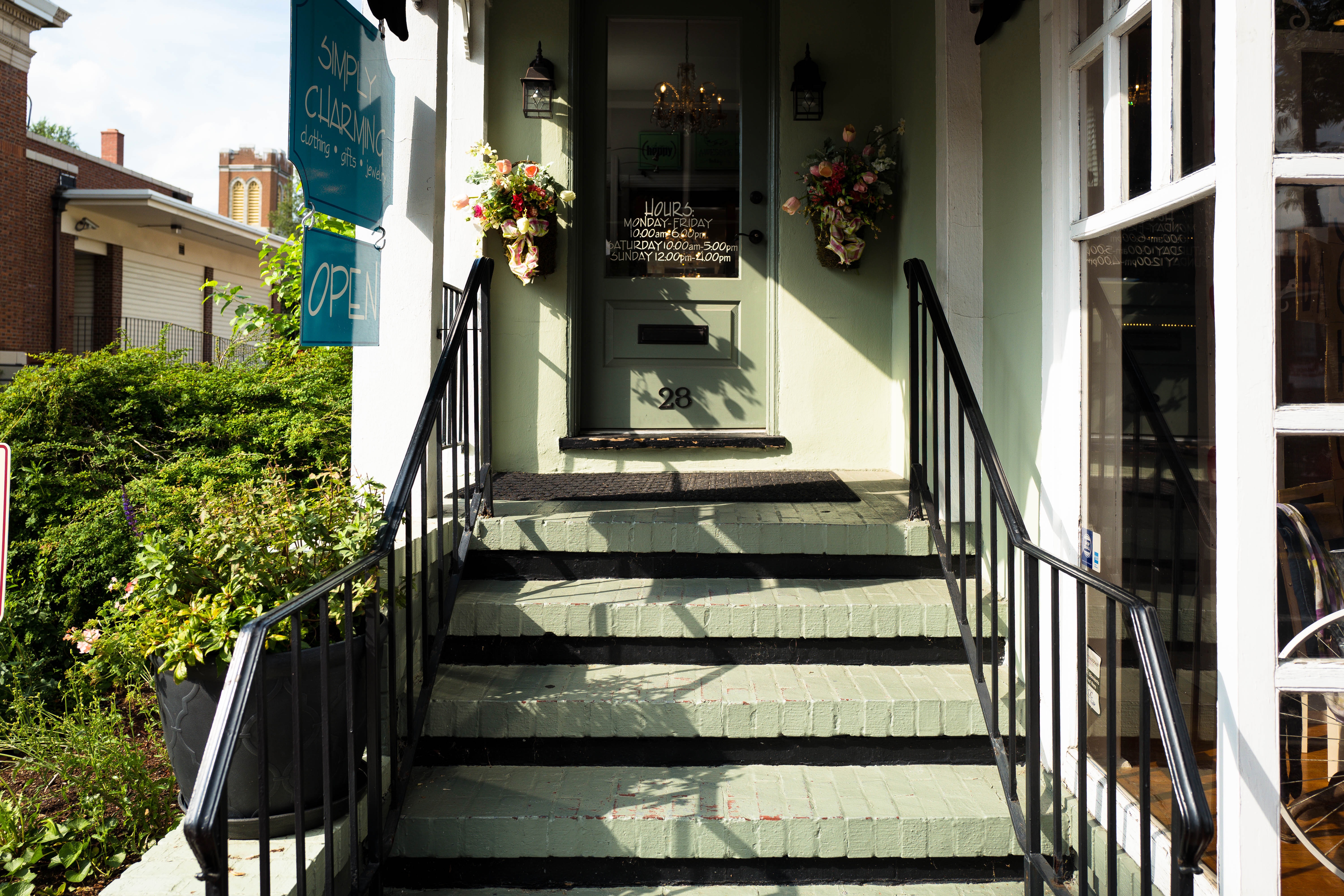 Bathed in warm, inviting sunlight, the staircase leads to a quaint boutique adorned with floral accents. The green and white color palette, complemented by hand-painted signs, creates a welcoming atmosphere. The gentle play of shadows enhances the cozy feel, inviting visitors to explore what lies inside.