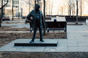 In a tranquil park setting, a bronze statue stands proudly, embodying a sense of wisdom and stillness. The warm, diffused light casts gentle shadows, enhancing the statue’s textured surface while a lone figure in the distance adds a sense of solitude. The composition invites contemplation, merging art with the quiet ambiance of the outdoors.