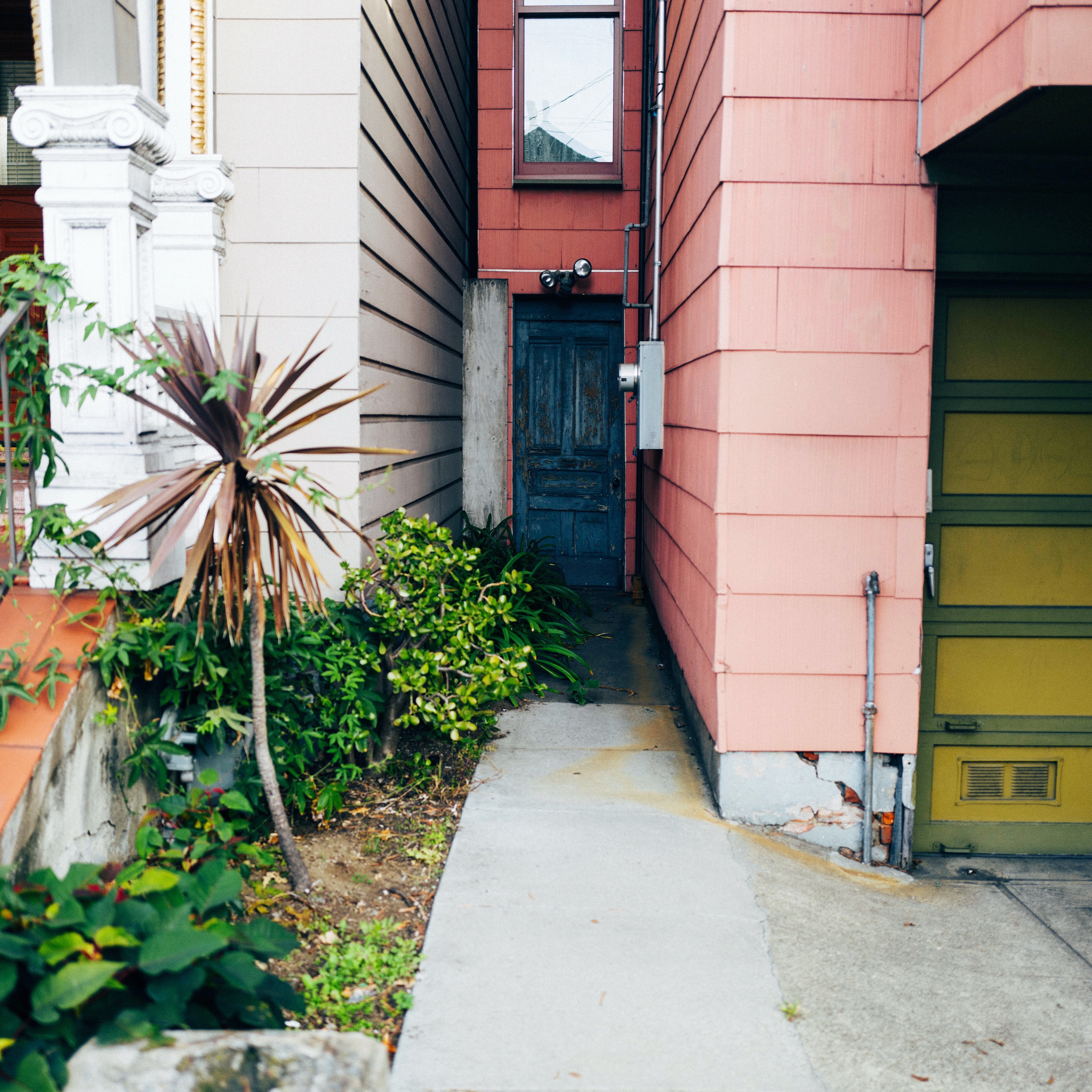 This photograph captures a narrow walkway hemmed in by two colorful buildings, creating a sense of intimacy and enclosure. The muted lighting highlights the textures of the walls and the vibrant green foliage flanking the path, evoking a feeling of quiet contemplation. An old blue door at the end beckons with a touch of mystery, inviting exploration into the hidden spaces beyond.