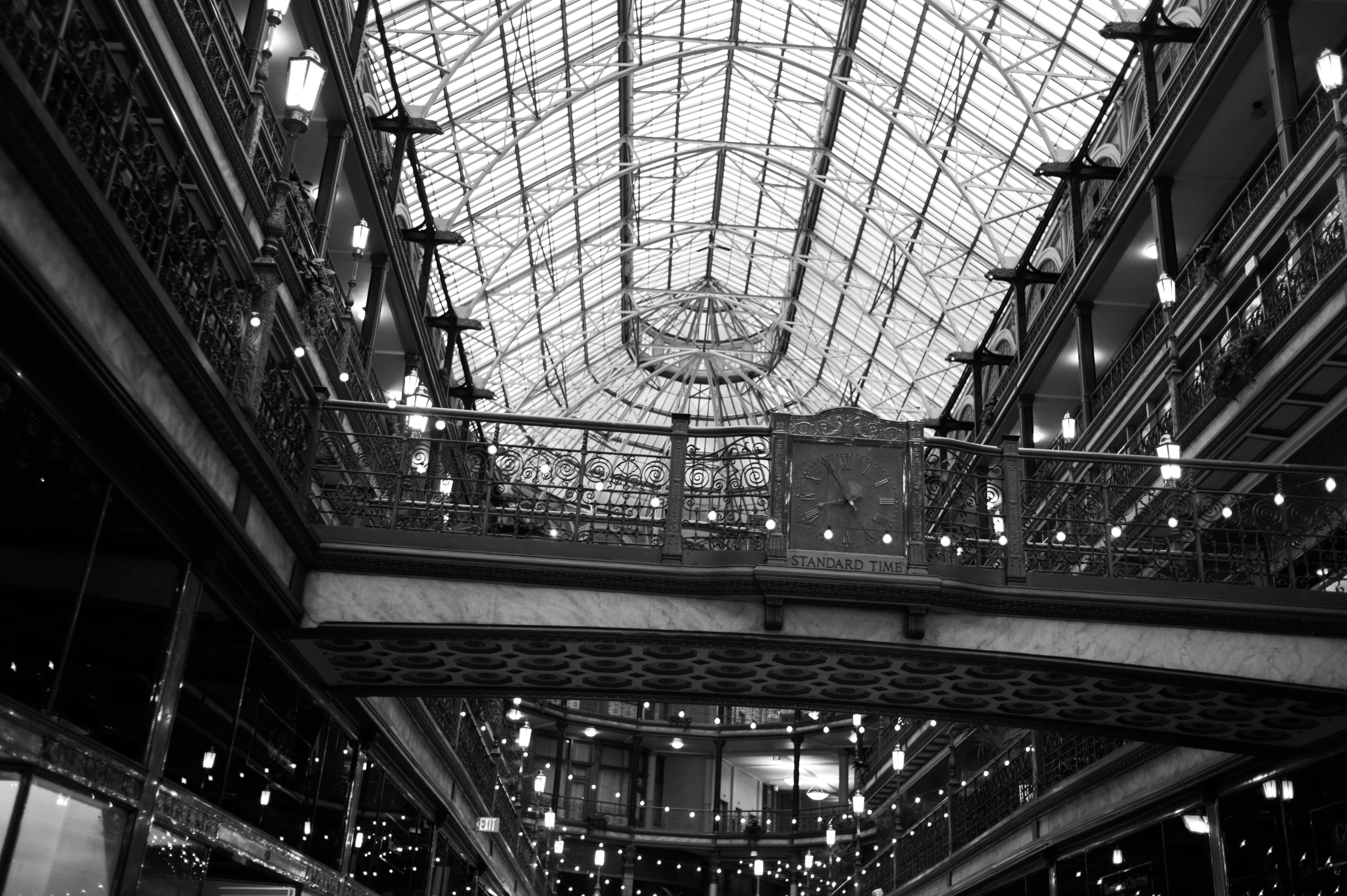 This photograph captures the stunning architecture of a historic atrium, characterized by intricate ironwork and expansive glass ceilings. The black-and-white palette enhances the mood, creating a timeless elegance, while warm light bulbs cast soft illumination from above. The composition draws the eye upward, inviting the viewer to admire the details of the structure and the sense of grandeur it evokes.