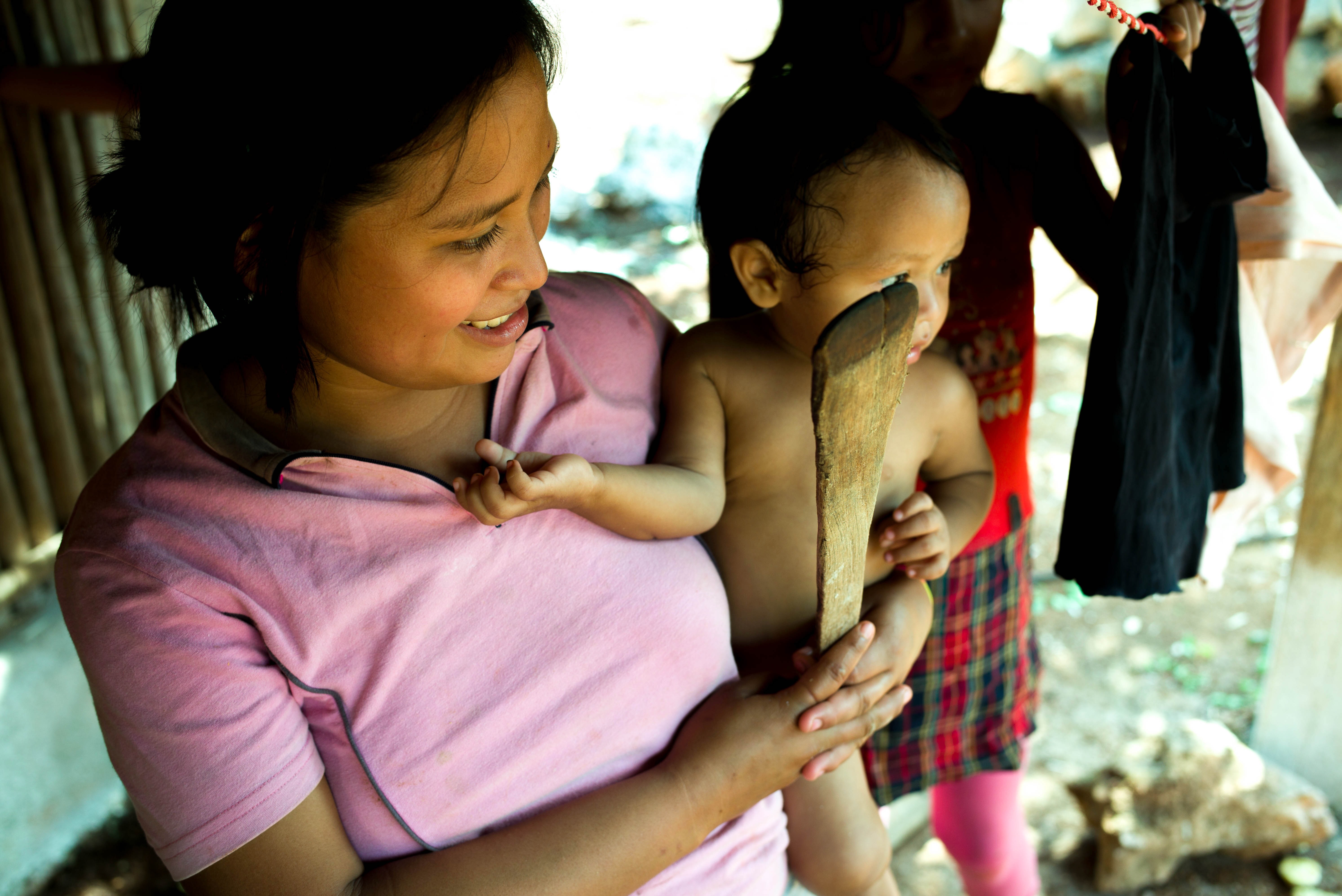 The photograph captures a warm moment between a mother and her child, conveying a sense of joy and intimacy. Soft, natural light filters through, illuminating their faces and creating a cozy atmosphere. The mother's gentle smile and the child's curiosity highlight the bond between them amidst a simple, rustic backdrop.