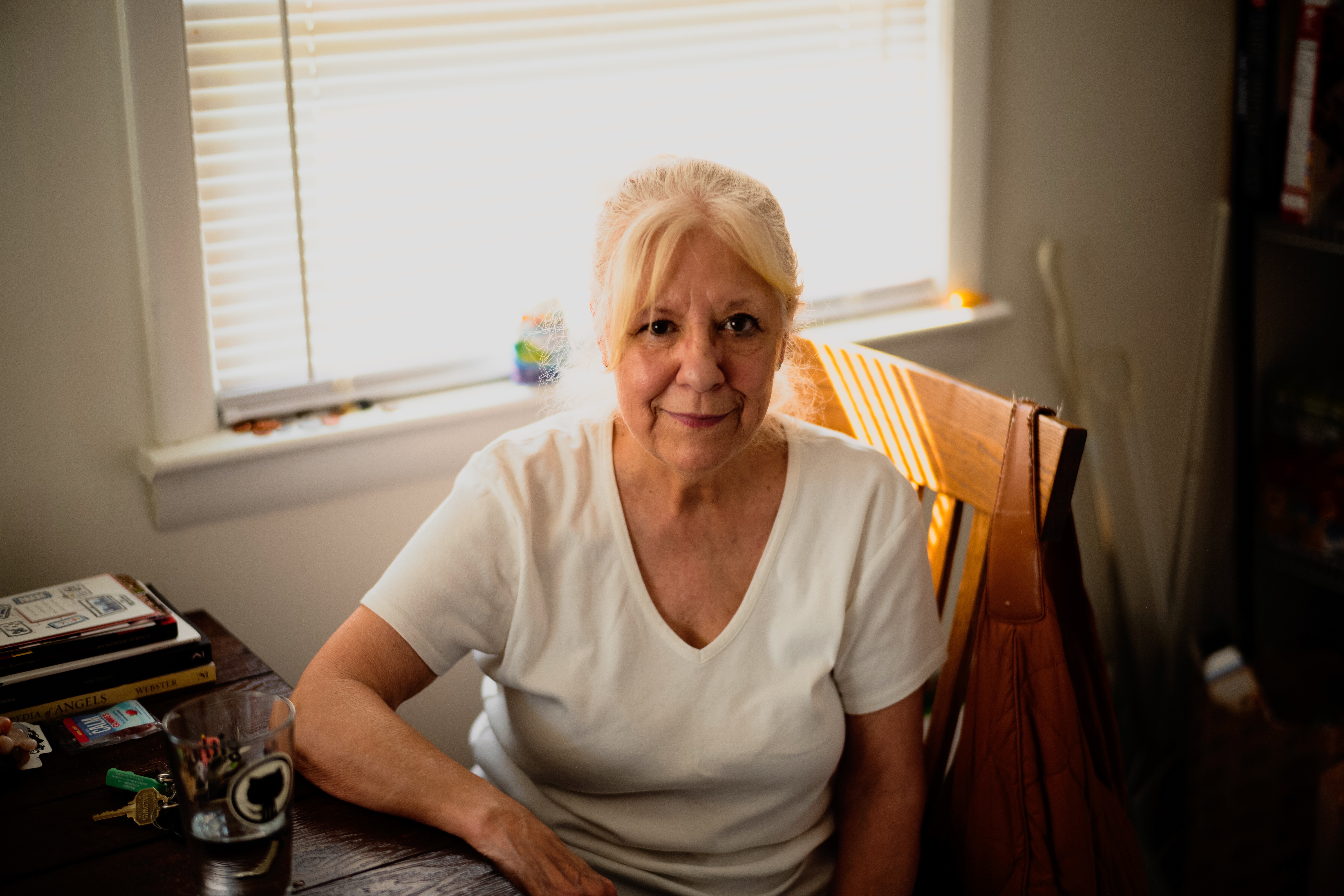 In this intimate portrait, an elderly woman sits comfortably at a wooden table, her soft smile radiating warmth and wisdom. The diffused light streaming through the window casts a gentle glow, enhancing the cozy atmosphere of her home. The cluttered background hints at a life rich in stories and memories, inviting a sense of nostalgia and connection.