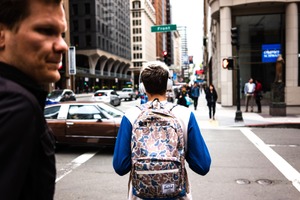 A young man, clad in casual attire and headphones, strides confidently down a bustling city street, his patterned backpack contrasting against the muted tones of the urban landscape. The scene captures a moment of motion, framed by the sharp lines of skyscrapers and the blurred movement of cars rushing by, evoking a sense of vibrant city life. The lighting is soft, hinting at an overcast day, creating a contemplative mood amidst the hustle and bustle of the crowd.