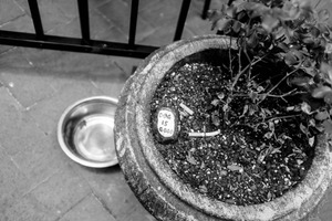 In a stark black-and-white composition, a round stone pot cradles a small shrub alongside a charming inscription, 'Dog is Good.' The mood is whimsical yet grounded, capturing a playful essence that highlights the bond between pets and their owners. An empty silver bowl nearby hints at companionship, echoing a loving home atmosphere.
