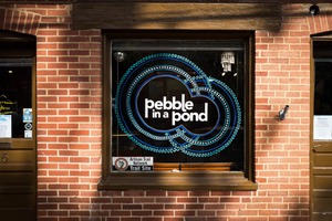 The photograph captures a vibrant café window featuring a whimsical sign that reads 'pebble in a pond.' The warm sunlight illuminates the brick exterior, creating a cozy and inviting mood, while the circular design of the sign draws the eye. This scene balances a touch of urban charm with a hint of artistic flair, perfect for passersby to stop and admire.