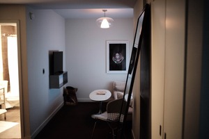 This photograph captures a modern, minimalist living space characterized by its clean lines and subtle color palette. Soft, diffused lighting from the pendant fixture casts a warm glow across the room, enhancing the serene atmosphere. The sparse furnishings and artworks invite contemplation, making it an inviting escape from the hustle and bustle outside.
