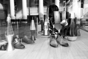 This black-and-white photograph captures a striking juxtaposition of polished shoes and retro decor, inviting viewers to reflect on the relationship between style and nostalgia. The soft lighting enhances the mood, creating an intimate glimpse through a window that hints at stories untold. The blurred reflections add depth, merging the outside world with the cozy interior, evoking curiosity and contemplation.
