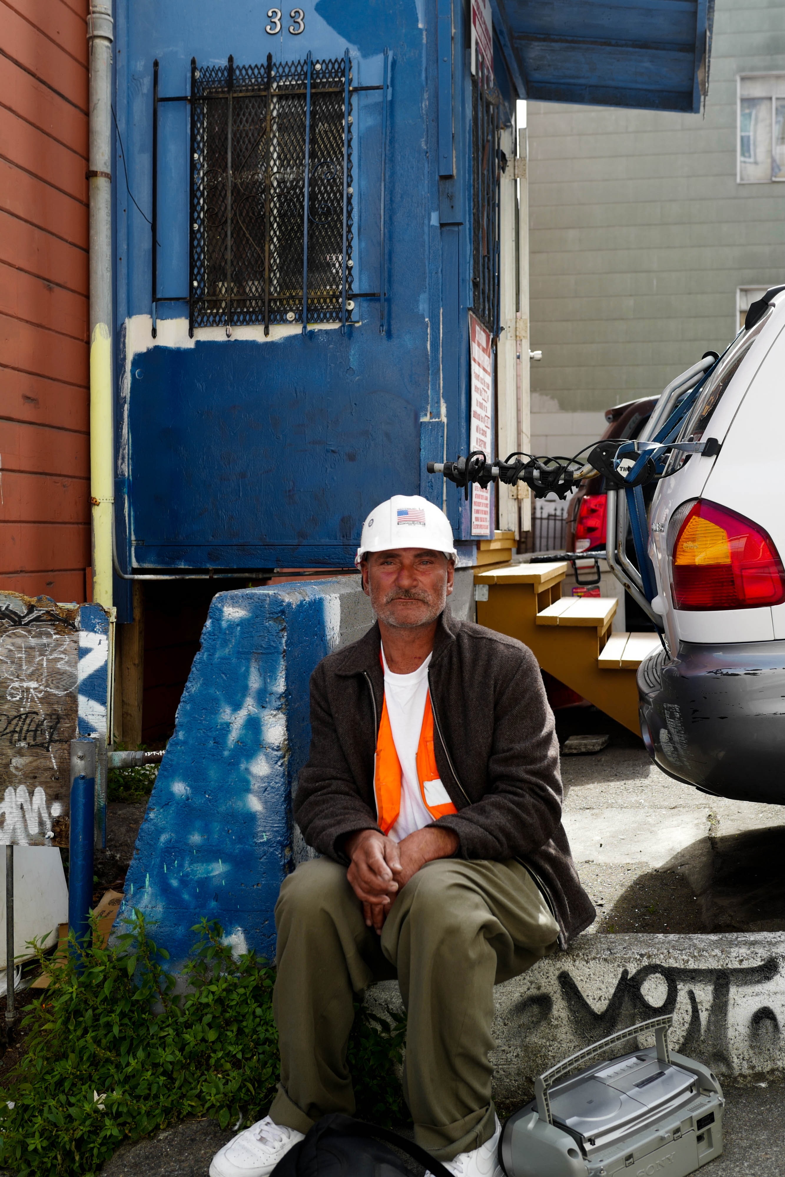 The photograph captures a weathered man sitting on a concrete step, embodying a moment of quiet reflection amidst the urban bustle. Dressed in a hard hat and a bright orange vest, he gazes directly at the camera, emanating a mix of resilience and vulnerability. The bold blues and greens of the surrounding environment contrast with his muted attire, emphasized by soft lighting that highlights the textures of his face and clothing.