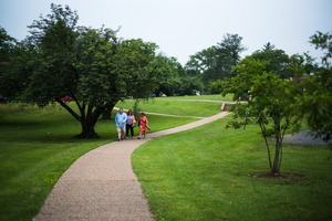A family strolls along a winding path through a lush green park, framed by soft, overcast skies. The scene exudes a sense of tranquility and togetherness, highlighted by the gentle curves of the walkway. The rich green hues of the grass and trees enhance the peaceful mood, inviting viewers to cherish moments of connection in nature.