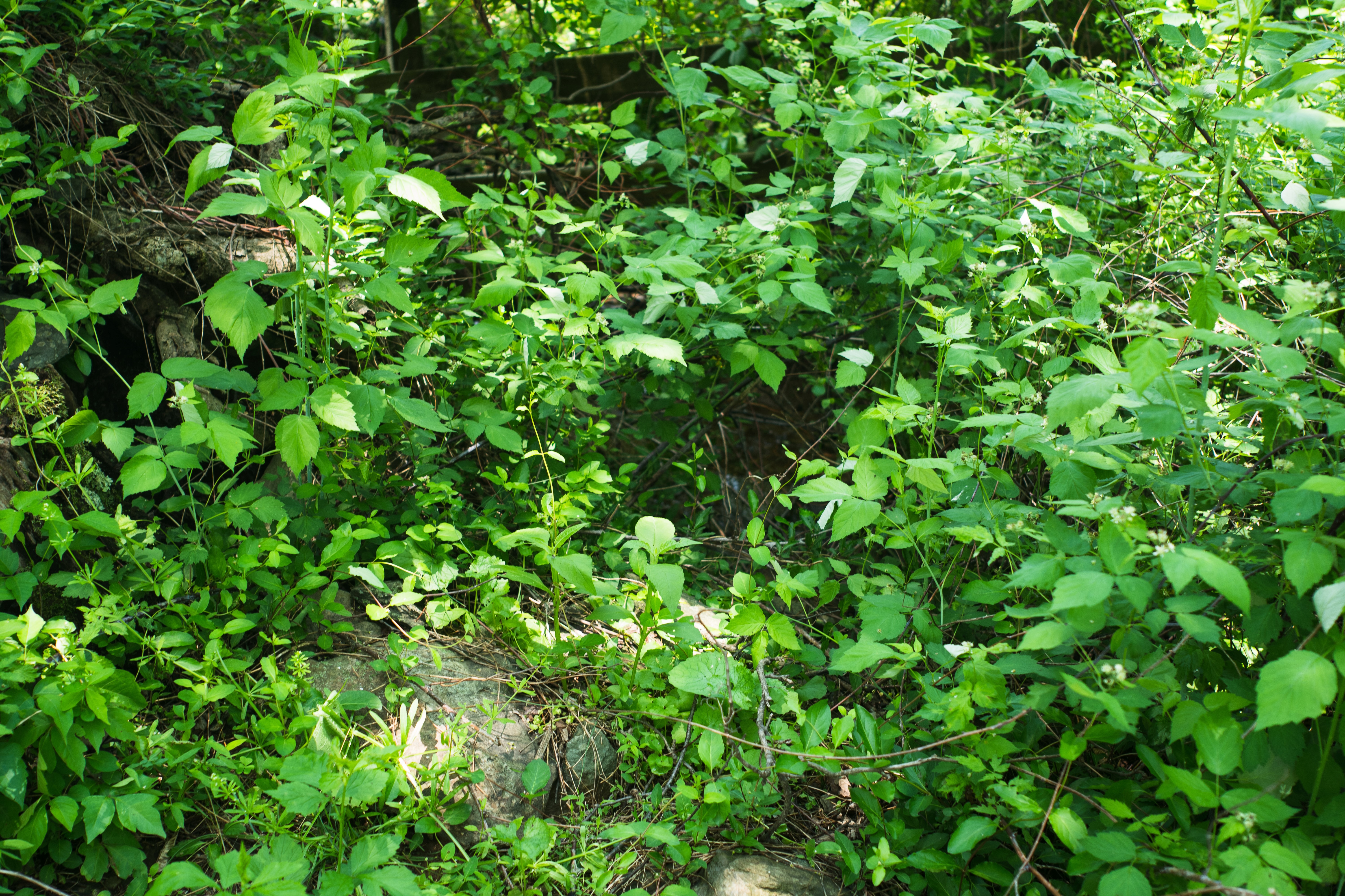 This photograph captures an abundance of vibrant green foliage, creating a sense of depth and lushness in the woodland. Soft sunlight filters through the leaves, illuminating the various shades of green, which evoke a tranquil and serene atmosphere. The composition draws the eye into a wild, natural environment teeming with life, inviting exploration.