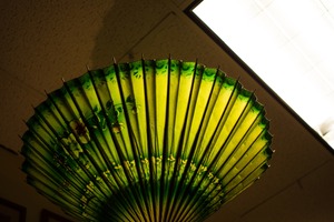This photograph captures a vibrant green umbrella, adorned with delicate floral details, bathed in warm overhead light. The composition emphasizes the umbrella's intricate folds and textures, creating a sense of whimsy and nostalgia. The contrasting lighting highlights the vivid colors, evoking a cheerful and inviting mood.
