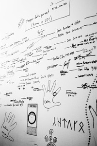 This monochrome photograph captures a wall adorned with names, dates, and handprints, creating a tapestry of human connection and fleeting moments. The chaotic arrangement of handwritten notes and sketches evokes a sense of nostalgia, as if the marks left behind tell stories of past encounters. Soft light highlights the textures of the wall and the ink, emphasizing the intimate and personal nature of these inscriptions.