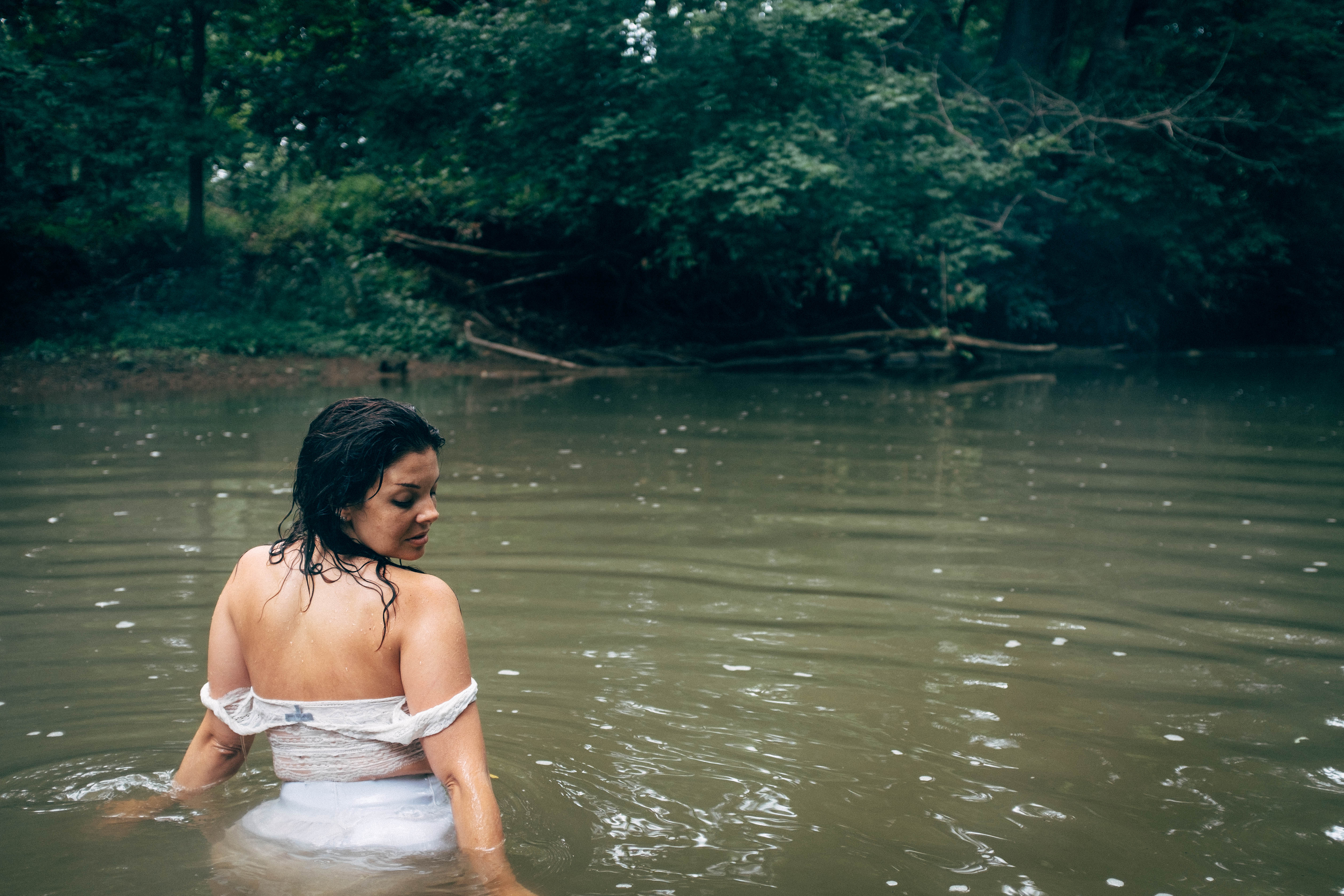 A lone figure stands gracefully in the murky waters, her back turned to the viewer as she wades through a serene landscape. The gentle ripples in the water reflect the lush greenery surrounding her, creating an air of tranquility. Soft, diffused lighting enhances the intimate mood, capturing a moment of quiet reflection amidst nature's embrace.