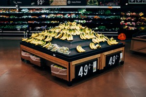 A striking display of bananas forms a visually captivating pyramid atop a black serving table in a grocery store. The warm lighting accentuates the vibrant yellow of the bananas, creating an inviting atmosphere. Surrounding shelves filled with fresh produce enhance the composition, adding depth and variety to the scene.