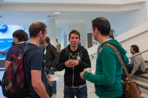 In a bright, modern indoor space, three men engage in lively conversation, their expressions animated and welcoming. Soft, natural light bathes the scene, highlighting the comfortable atmosphere of exchange and camaraderie. The composition captures both the intimacy of their discussion and the broader context of a bustling social environment.