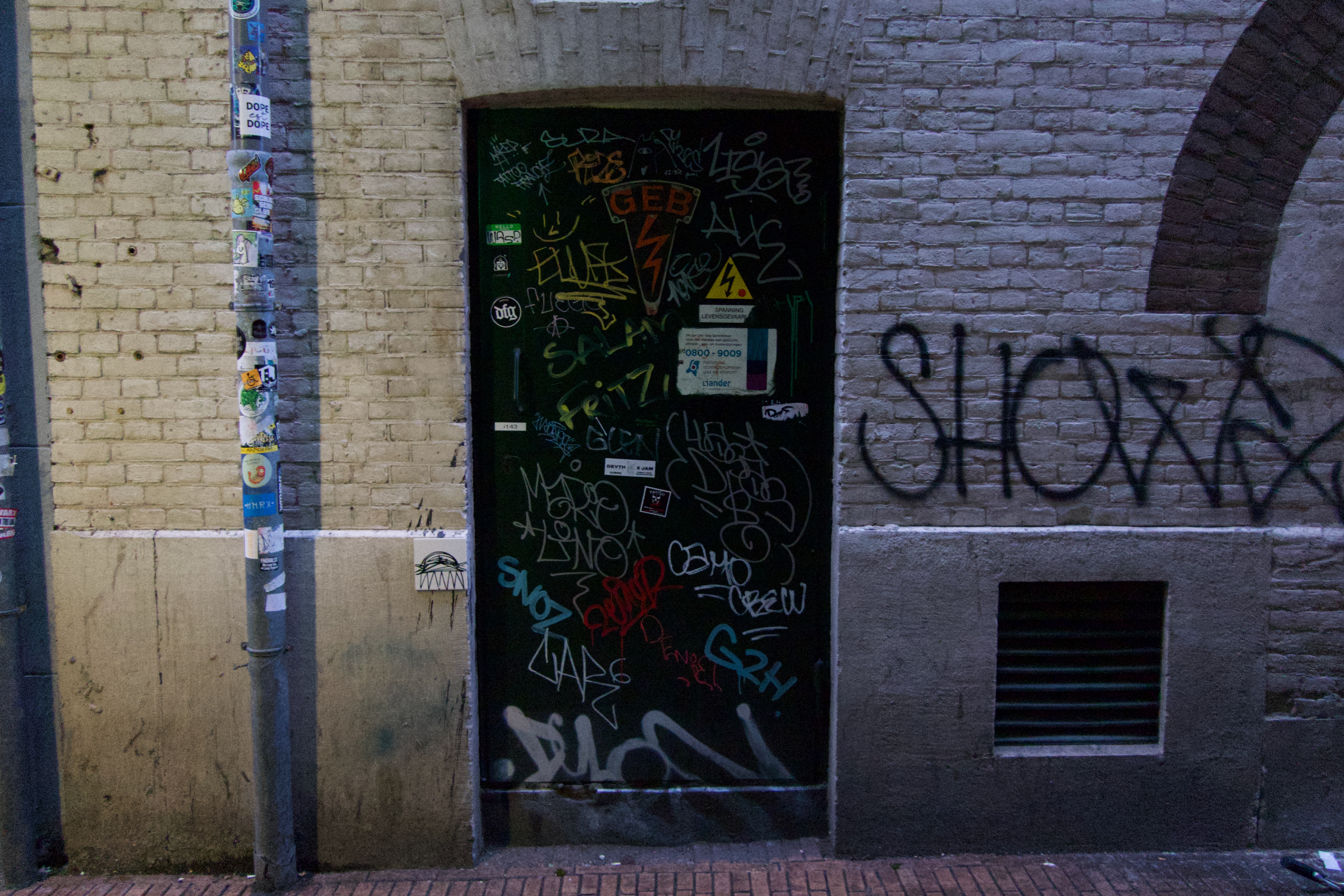 The photograph captures a mysterious doorway engulfed in a chaotic tapestry of graffiti and stickers, suggesting an underground cultural vibrancy. The dim lighting enhances the gritty urban atmosphere, while the contrasting textures of the wall and door draw the viewer's eye into this uninviting yet intriguing space. A sense of anonymity and rebellion permeates the scene, inviting curiosity about the stories hidden behind the door.